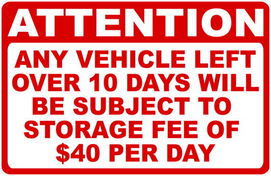 Attention Any Vehicle Left Over 30 Days Subject to Storage Fee Sign Customizable