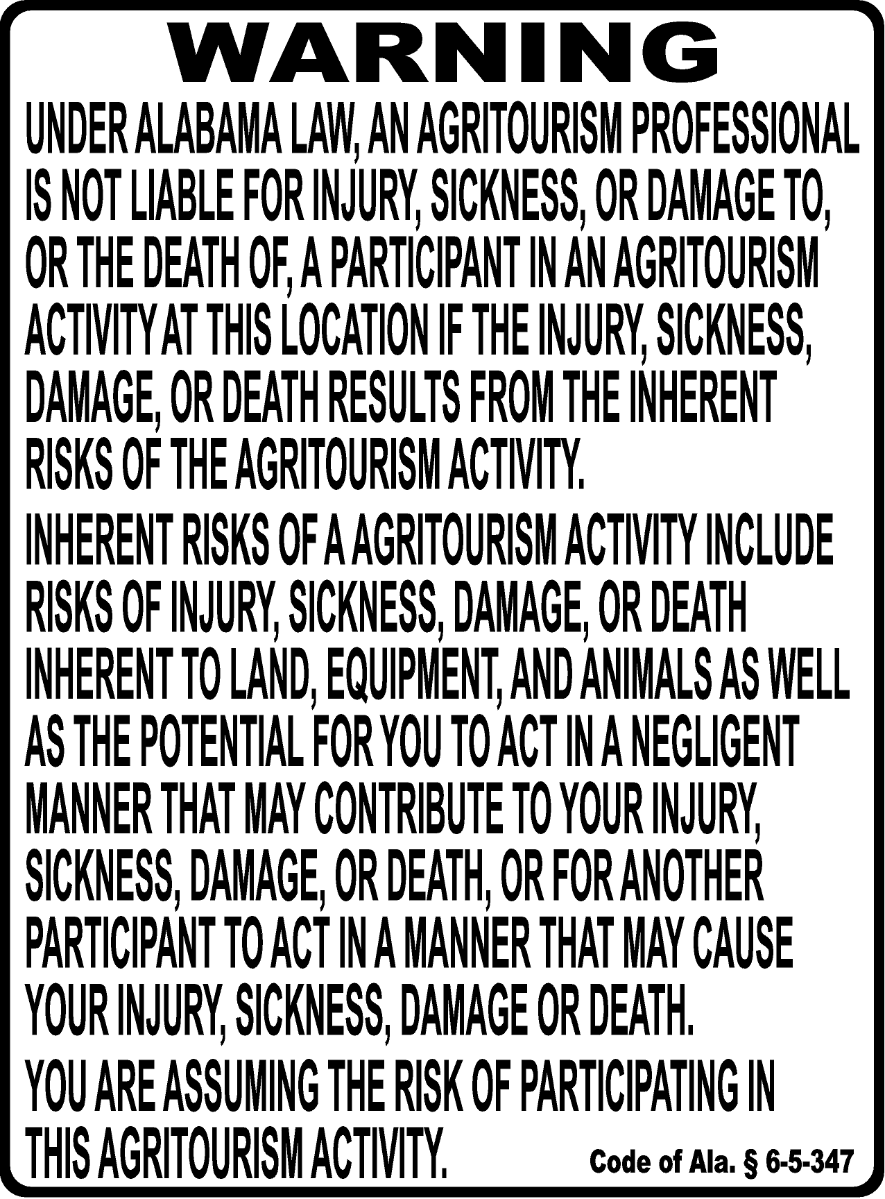 The Agritourism Liability Law Sign for Alabama serves to notify customers, and all participants in agritourism activities on your property that your business is not liable for any accidents or injuries that occur on the premises. Ensure compliance with state law by posting this aluminum sign in plain view.