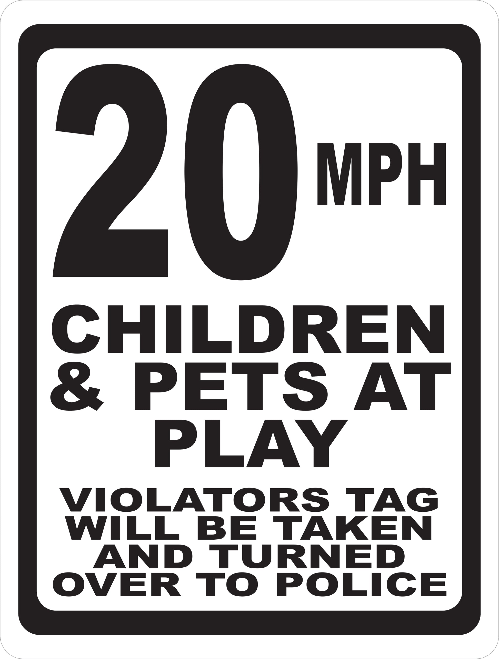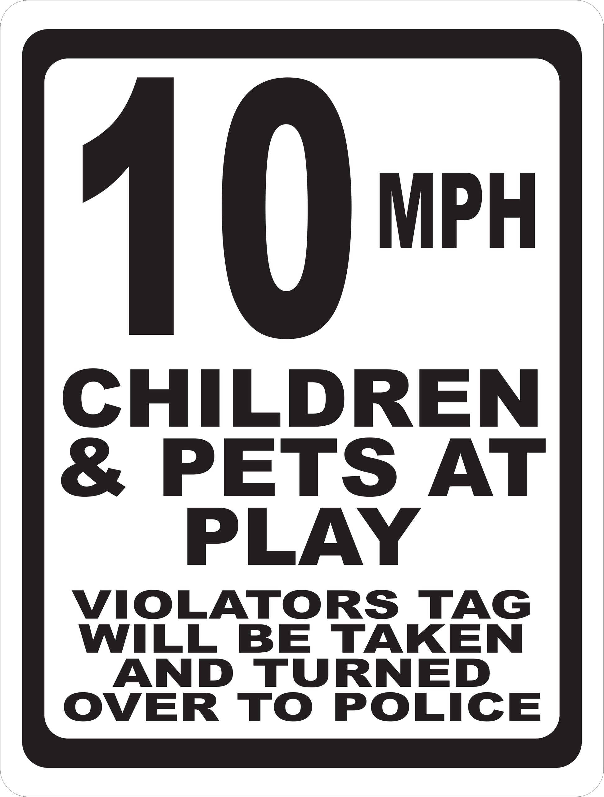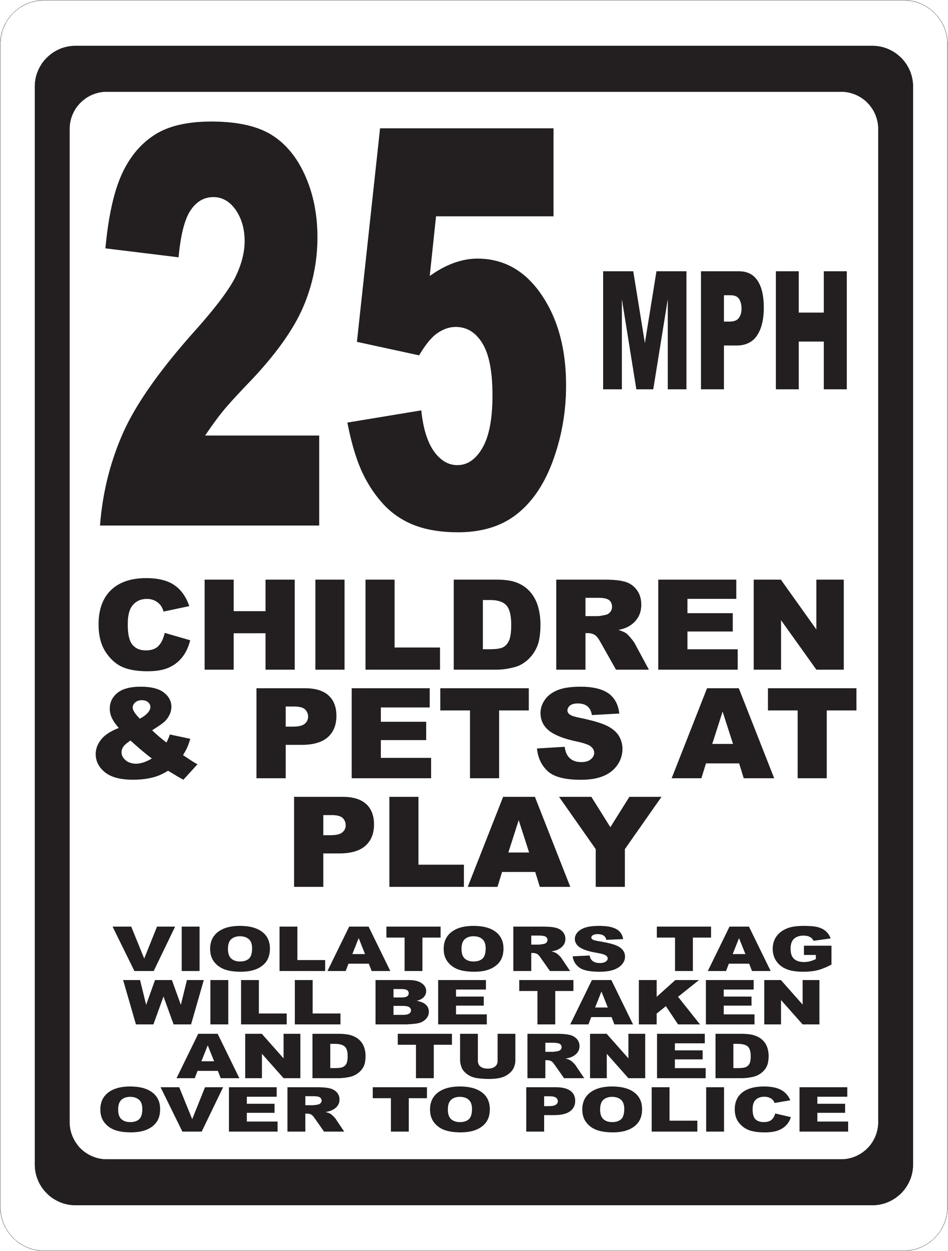 This sign alerts drivers to slow down and be aware of any children and pets playing in the area. Violators will be reported to the local authorities. Choose between various speeds.
