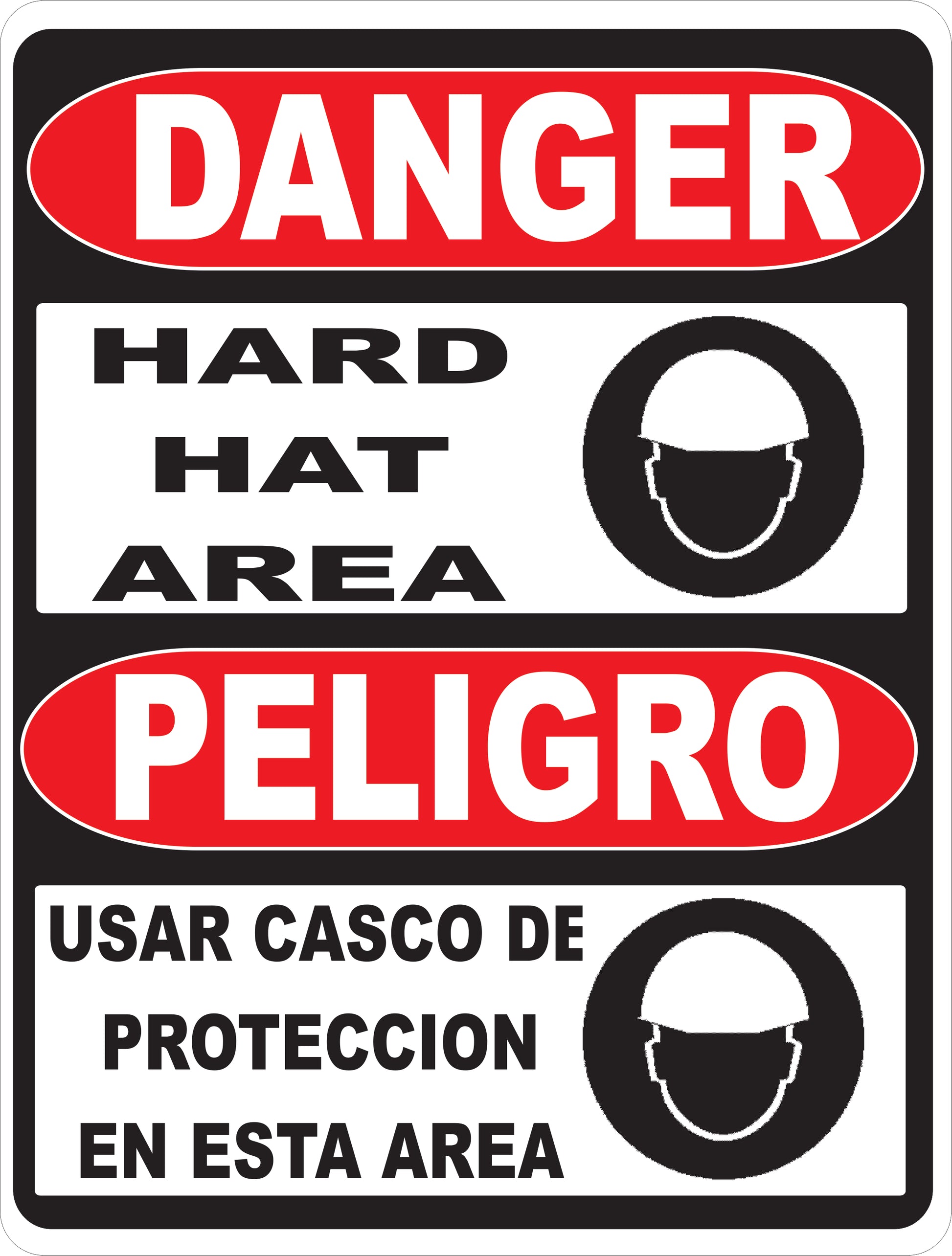 Danger Bilingual Hard Hat Area Sign. Peligro Usar Casco de Proteccion en Esta Area Sign Details